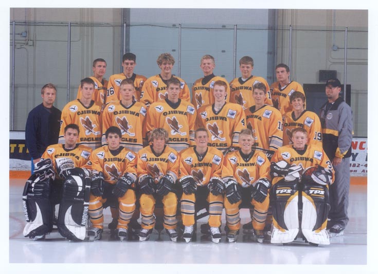 | 2004-05 Ojibwa Eagles ![]() Back Row L-R: Michael Babcock, 2, 3, Tim Viola, Ryan Greenley, 6. Middle Row L-R: Asst. Coach Ed Kattelus, 2, Tyler Ries, 4,5,6,7, Coach Scott Nevenhoven. Seated L-R: Rob Devaun, 2, 3, Jeff Erkkila, 5, Andy Brand. other Players: Garrett Russell, Thomas Schulz, Alex Redmond, Kyle Waisanen, Richard Ledy, Jake Hauswirth, Rick Delecke, Eric Kattelus, Kyle Rowe, James Krusic, Kyle Elmblad. Please Contact the webmaster if you can identify these players! |
