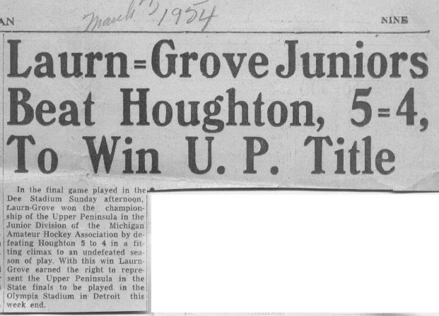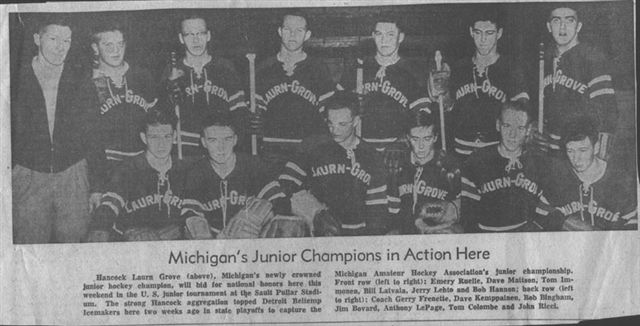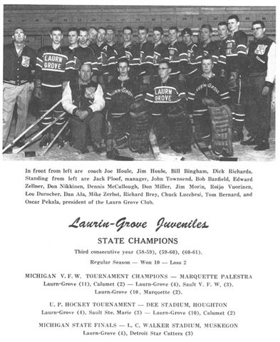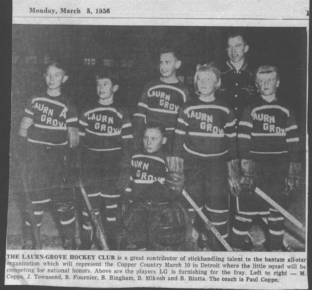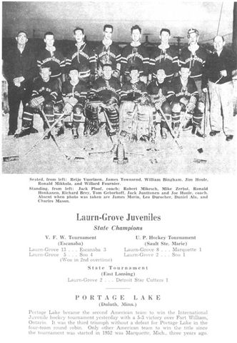 1958 The Hancock Laurn-Grove Juniors, won the State Championship Title. Members of this team were: .... Please contact the webmaster if you have more info or a picture of this team! | 1958-59? Laurn-Grove Juveniles State Champions! ![]() Standing L-R: Jack Ploof -coach, Robert Mikesch, Mike Zerbst, Ronald Honkanen, Richard Brey, Tom Geborkoff, Jack Junttonen, Coach Joe Houle. Seated L-R: Reijo Vuorinen, James Townsend, William Bingham, Jim Houle, Ronald Mikkola, Willard Fournier. if you have a better copy of this picture, please contact the webmaster. |