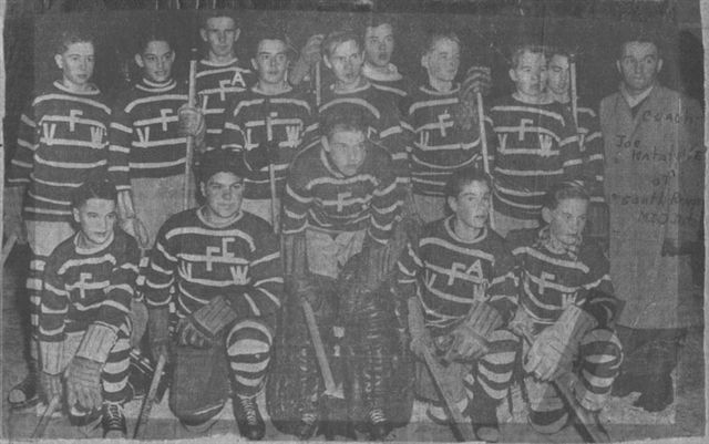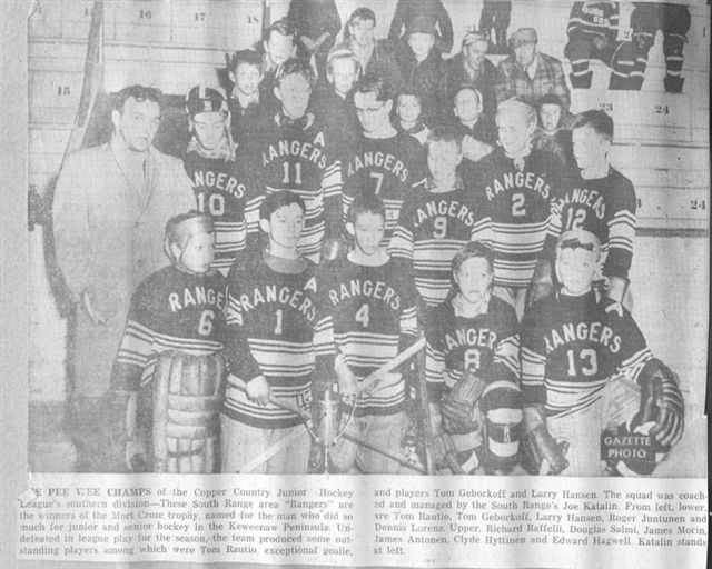 19-- need date South Range Rangers PeeWee Champs of So. Div. & Mort Croze Cup Winners ![]() Upper Row L-R: Joe Katalin -Coach/Mgr, Richard Raffelli, Douglas Salmi, James Morin, James Antonen, Clyde Hyttinen, Edward Hagwell. Lower Row L-R: Tom Rautio, Tom Geborkoff, Larry Hansen, Roger Juntunen, Dennis Lorenz. |